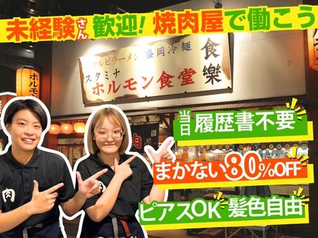 仕事内容 焼肉ホルモン食樂スタッフ募集! 【ホールのお仕事】 ・フード、ドリンク提供 ・席の片付け、テーブルセッティング ・オーダー取り・席へのご案内、レジ業務 ・ダクト清掃(営業終了後)等 ■はじめての接客も大丈夫! 「人と話すの苦手だな」って人も 「人見知りなんで」って人も スタッフ同士、みんなでわいわい連携して お店を回していくので、だんだんと人と話すことに慣れてくる方が多数! ■学校帰りにサクッと働ける!学業優先OK ・授業・テスト・サークル活動をしっかり考慮 ・夕方・夜のスキマ時間を有効活用 ・土日だけの勤務もOK ・まかないで食費節約! ・就活や試験期間の休み相談も柔軟対応 ★どんな理由でもWelcome★ ・髪色、髪型自由 →金髪や推しカラーOK ・ピアスOK(規定有) ・オフィスネイルOK(規定有) メイクおしゃれも楽しめる ・スタッフ同士の協力体制バツグン