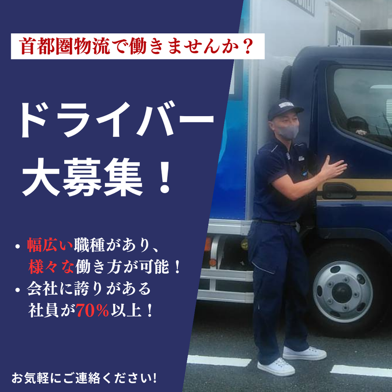 アピールポイント: ⭐️この求人のポイント⭐️ ・輸送量の減少による給料変動無し ・週2~3日勤務からOK!WワークもOK! ・未経験者でも安心の研修制度! ・社員登用制度あり! ⭐️首都圏物流グループについて⭐️ 私たち首都圏物流グループは昨年、創業50周年を迎えた物流会社です。 「安全第一」を掲げる首都圏物流グループでは、無事故表彰制度をなどを導入し 事故ゼロを目指してさまざまな取り組みを行っています。 従業員の皆さんにも働きやすく、家族や友人に誇れる会社を目指し「社員満足度調査」等も実施。 日々、より良い職場づくりに取り組んでいます。 物流のプロとして共にサービスを提供するため、ぜひあなたの力を貸してください。