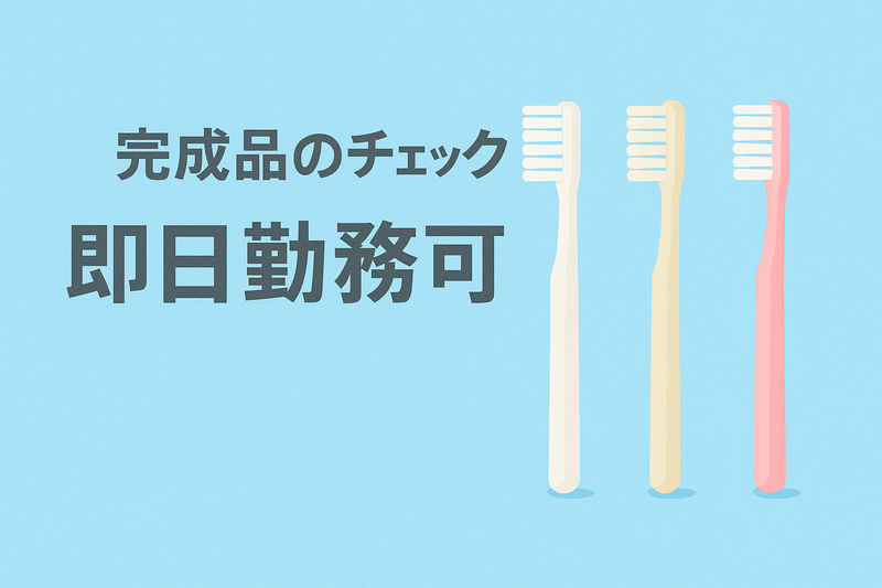 仕事内容 \ 歯ブラシの完成品検査 / 成形された歯ブラシに異常が無いか確認するお仕事 色や長さなどの確認をお願いします。 ✅土日休みで無理なく働ける! ✅思い立ったらすぐスタートOK ✅未経験でもすぐ慣れるシンプル作業 ✅20~40代の男性スタッフが多数活躍中♪