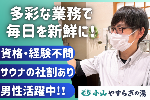 【総合職】週休2日制/経験者も未経験者もOK!/温泉・サウナの社割あり/充実の待遇/★賞与年2回あり 「スーパー銭湯 小山やすらぎの湯」での総合職をおまかせする社員を増員募集いたします! はじめはフロント業務をメインに行っていただきます。 業務に慣れてきたらご自身のペースで、できる事を増やせれば大丈夫! ご入社後はイチから先輩スタッフが丁寧にご指導します! これまでの接客経験やスキルを十分に活かしてください♪ \アピールポイント/ ■資格、経験不問の正社員採用! ■賞与や各種手当で高収入実現可能! ■週休2日制でプライベートも充実!! ■温泉やサウナが好きな方には嬉しい社割。 ■20代~40代の男女が幅広く活躍中! 皆様とお会いできる日を楽しみにしています♪