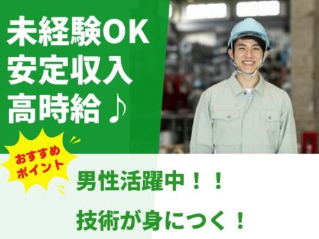 仕事内容 \ここがポイント/ ★未経験から始めるモノづくり! ★高時給1400円で安定収入◎ ★土日休みでプライベートも確保♪ ★20~40代の男性スタッフが多数活躍中! *・。・。*・。・。*・。・。* <仕事内容> \手に職つける!金属製品の溶接スタッフ/ 工場内で金属製品の加工・溶接を行うお仕事です。 ・鋼鉄やステンレスを切断し、穴あけや曲げ加工 ・ベテラン社員から技術を学びながら溶接作業に挑戦! ・最初は簡単な補助作業からスタート♪ *就業後の業務変更はありませんので、安心して続けられます! *・。・。*・。・。*・。・。*