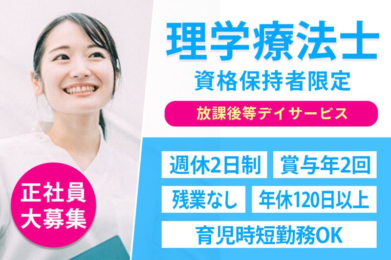 【アピールポイント】 放課後デイサービスで理学療法士を正社員募集! ※理学療法士資格お持ちの方限定※ ◇昇給・賞与(年2回) ◇週休2日制・年休120日~ ◇残業なし ◇資格取得支援制度あり ◇育児短時間勤務制度あり