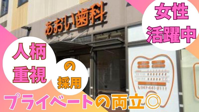 仕事内容 ◆完全週休2日!プライベートとの両立◎◆ ◆年間休日120日!残業なし◆ ◆駅チカだから通勤ラクラク◆ ◆無資格・未経験OK!人柄重視の採用◆ ◆開院して9年目!キレイな職場☆◆ < 具体的な仕事内容 > ー ◆先生の治療のサポート ⇒口の中にたまった水をバキュームで吸う、 器具の受け渡し、セメントを練る、 治療後の注意事項説明などを行います。 ◆器具の洗浄、滅菌 ⇒使用した器具を すべて洗浄・消毒・滅菌します。 その他受付業務 ・電話対応や予約受付、会計業務など ◤ ̄ ̄ ̄ ̄☎⋆.✩ ̄ ̄ ̄◥ お電話でのご応募も歓迎 ℡/047-441-2111 ◣__________◢ ー クリニックや診療所などでの 勤務経験がなくてもOK! 「人柄重視」の採用をしています☆ まずは最初は患者様を笑顔でお迎えし、 心地よい雰囲気を提供するところから! 研修期間を通じて一つ一つ丁寧に業務を 教えていくので安心して勤務可能です。 ** ◆◆あおい歯科医院について◆◆ 当院では「寄り添う」姿勢を 大切にしています。 患者様の希望を叶えるためには、 しっかりと患者様の声に耳を傾ける姿勢と、 正確な診断や処置を可能にする豊富な知識、 そして確かな技術が欠かせません! 私たちスタッフ一同は、 カウンセリングに力を入れるとともに、 どのようなご希望にもお応えできるよう、 日々進歩する歯科医療について、 勉強や情報収集を行っています。 得意な治療を押し付けるのではなく、 患者様のご希望を優先した治療を提供。 私たち医療従事者の使命は、 患者様が健康になるための お手伝いをすることだと考えています。 だからこそ「押し付ける」のではなく 「寄り添う」姿勢を大切にしています。