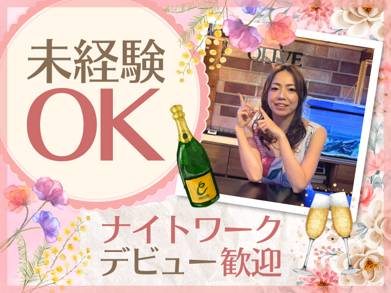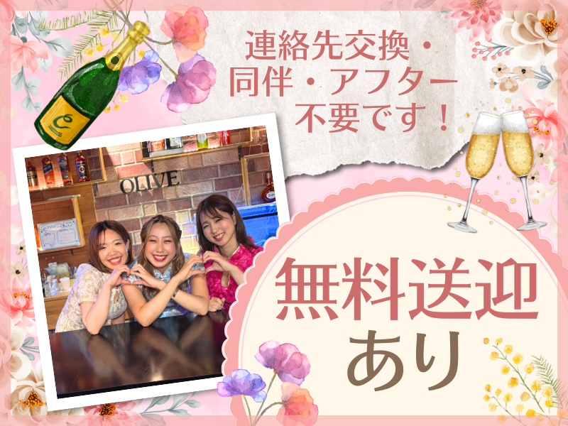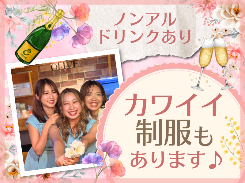 仕事内容 優しいママのもとで気軽にスタートできるお店♪ 「Bar OLIVE」にて、 バースタッフを募集します♪ ‥…━━☆‥…━━☆‥…━━☆ <★☆人気の訳は!☆★> 初めてでも優しいママががサポートしてくれるので、安心です。 常連さんがほとんどなので変なお客様はいてません! ノンアルOK!連絡先交換・同伴・アフターなしなので 親バレの心配もありません◎ Wワークや学校帰り、空いた時間だけでも 大歓迎ですのでシフトは気軽に相談してください♪ (例)学生、フリーター、会社員、週末のみ、平日のみ etc…. ※※20代が中心で楽しい雰囲気※※ ‥…━━☆‥…━━☆‥…━━☆ ⭐当店で働くポイント⭐ ⏩お酒は飲めなくてOK◎ ソフトドリンクで乾杯しましょう♪ ⏩ノルマ・連絡先交換・同伴アフター一切なし! チラシ配りもないので、安心して働けるお店です。 ⏩未経験でも最低時給2000円~! ⏩カワイイ制服は無料でお貸しします◎ 髪・ネイルピアス・アクセサリー自由♪ ⏩給与は全額日払いOK!(規定) 無料送迎で夜道も安心して帰宅できますよ◎ まずは【1日だけのお試し短期】もOK! お気軽にご応募お待ちしています! ⭐お仕事内容⭐ まずはカウンター越しの接客からスタート♪ 簡単なドリンクを作りながら、 お客様と会話していただくだけで完璧です◎ ⭐入店後の流れ⭐ まずは、お店の規定と、システムを説明します。 そこから店内へ。 お客様とおしゃべりするときも、 先輩スタッフがしっかりサポートするので 安心してトライしてみて下さいね◎ ⭐お客様のこと⭐ サラリーマンの方が多く、 紳士的な方が多いです。 常連さんがほとんどなので 変なお客様はいてません! ⭐「カワイイ」を応援するお店です⭐ あなたの可愛さを存分に引き出せる! それがうちの自慢です。 例えば…制服は無料でお貸しします。 学生服などのコスプレやワンピースなど、 みんなで選んで着ていますよ♪ ⭐夜職あるある、まったくなし!⭐ キャッチ、ビラ配り、連絡先交換、 同伴、アフター、個人&全体ノルマ… まったくございません! もちろん無理な飲酒も絶対になし◎ 未経験でも経験者でも、安心して働けますよ。 ⭐スタッフはほとんどが経験なし⭐ 当店で活躍しているスタッフは、 そのほとんどが「未経験」から! 勤務中は、みんなで声をかけあって いい雰囲気で働いています。 スキマ時間にコスメや大学の話をして 和気あいあい仲良く働いていますよ◎ ⭐勤務時間について⭐ ⏰15:00~24:00 ┗週2日~、4h~OK! シフト制 ★☆スタッフの出勤例☆★  ̄ ̄ ̄ ̄ ̄ ̄ ̄ ̄ ̄ ̄ ̄ ̄ <OLさん> 仕事終わりにサクッとお手伝い感覚で... 19:30出勤~22:00退勤 <学生さん> 学校終わりに寄り道感覚で... 18:00出勤~22:30退勤 <フリーターさん> 週4~5日 OPEN~23:00 だったり 20:00~LAST など... ⏩週5日(月20日以上)勤務は時給2400円~ ⏩終電考慮 ⏩22時以降は深夜手当あり ⏩大学・昼職との両立歓迎 ⏩お試し単発勤務も歓迎 働き方はみんなそれぞれ♪ 優しいママがしっかりサポートします★