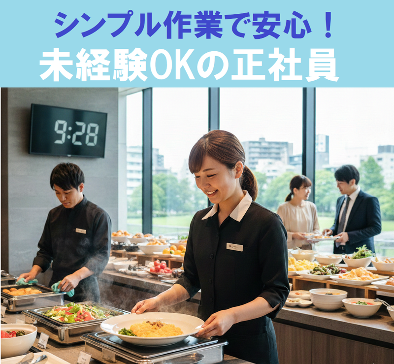 仕事内容 ⭐ 未経験OKの正社員、募集 ⭐ 注文取り・配膳なしのビュッフェ式だから 飲食店・接客・ホテル未経験者も大歓迎! ◤ ̄ ̄ ̄ ̄ ̄ ̄ ̄ ̄ ̄ ̄ ̄ ̄ ̄ ̄ ̄ 月給25万円以上のスタート! 経験者は開始月給30万円も可 _______________◢ ⏩14:30にはお仕事終了/残業なし ⏩まかない無料・交通費全額支給 ⏩面接1回のみ/見学だけでもOK ・お仕事内容 ビジネスホテル「ダイワロイネットホテル四ツ橋」内レストランでの朝食運営をお任せします。 プロが作るメニューを提供している、落ち着いた雰囲気の店舗です。 【ビュッフェ形式】だから「オーダー取り」「配膳」「レジ業務」一切なし! 飲食店未経験・接客未経験・ホテル勤務未経験の方も大歓迎です。 マニュアル完備&先輩が横について教えるので、安心。 店舗展開を目指しておりますので、将来は責任者も目指せます! 【具体的には…】 ■ビュッフェメニューの調理、簡単な仕込 ■お料理の補充 ■お客様が使い終わった食器の回収・洗浄 ■営業前後の準備や清掃 (座席数は約60席でバタバタしません) ■簡単な事務 (ホテル側との打ち合わせや発注業務など) \未経験でも安心の理由!/ ✅注文取りなし・配膳なし ✅現金の取り扱いなし ✅メニュー説明もほぼなし ✅「補充」「片付け」「洗浄」が中心 ✅1日の流れが決まっていて覚えやすい ✅先輩が最初の1〜2週間は必ずフォロー -✨ 職場のアピールPOINT ✨- ●とっても美味しいまかないが、無料♪ ●交通費全額支給!通勤ラクラク駅近 ●バイク・自転車通勤もOK ●14:30には「お疲れ様でした!」 ●残業はありません! ●休みも月9日以上+有給休暇もあります -✨ さらに当社はここが◎ ✨- ●本部に申請なしで有給取得OK ●制服・マスクなど全て会社支給 ●ボーナス・退職金・産育休実績あり ●引っ越しが必要な転勤なし! ●月1回、食品などが当たる抽選会あり ●お休みしても給与保証あり! 衛生上の体調不良で自宅待機をお願いした場合、給与の6割保証。小さいお子様がいる方も安心。 ✼┈••✼••┈••✼••┈••✼••┈••✼••┈✼ ✨ オープニングスタッフ同時募集 ✨ 「奈良駅前」「新大阪駅近く」の ホテル内レストランも当社運営となって 新オープン予定!スタッフ募集中です。 ✼┈••✼••┈••✼••┈••✼••┈••✼••┈✼ <こんな会社です> 全国にスタッフ3000名在籍の安定企業。 創業60年以上の実績で、長く働ける環境。 ⭐温かな社風で「3年定着率90%!」 当社はフルーツやビール等が当たる「プレゼント抽選会(毎月)」の実施など 従業員を単なる労働力ではなく、 共に歩む「仲間」として大切にする文化が根付いています。 ⏩面接1回のみ!筆記・実技なし ⏩応募は約1分でカンタン入力 ⏩電話応募も歓迎▶06-6152-9061