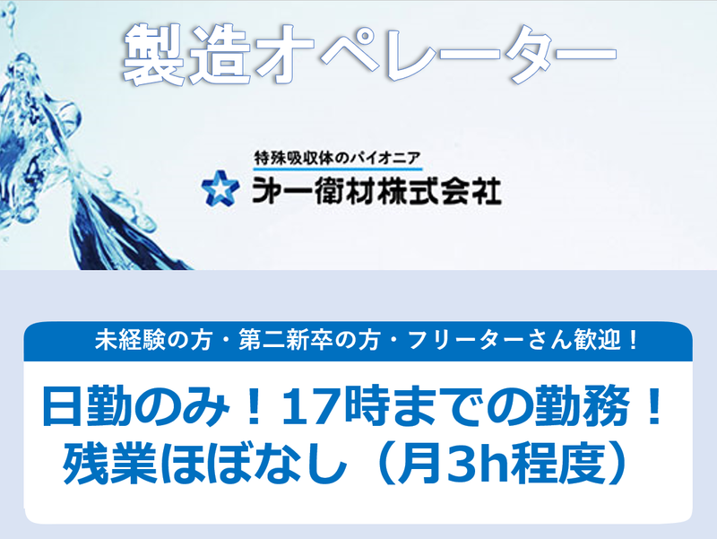 仕事内容 ●================● \\この求人のポイント// ●================● ✅創業50年以上の安定企業で働ける ✅残業は月平均約3時間と少なめ ✅日勤のみの勤務!家庭との両立がしやすい◎ ✅未経験・第二新卒も積極採用中! 日勤のみ&残業少なめ&転勤なしで家庭と仕事の バランスを大切にしたい方にぴったりの職場です! ●================● <お仕事内容> ●================● 紙加工品の生産設備のオペレーションや 保守・保全業務をお任せします。 ◎具体的には… ⏩機械操作・調整 └生産設備を操作し、 必要に応じて調整を行います。 ⏩生産品の切替 └製品ラインの切替作業を行います。 ⏩設備の保守・保全 └生産設備の状態をチェックし、 必要なメンテナンスを行います。 【対象製品】 ……………………………………… 吸収体をベースにした 液体や気体を吸収する商品 ◆大人用紙おむつ ◆生理用ナプキン ◆ペットケア用品 など 【主要工程】 ……………………………………… パルプ粉砕 ▼ パルプ積層 ▼ 吸収剤(ポリマー) ▼ 散布 ▼ エンボス加工 ▼ 折り加工 ▼ 包装・梱包 【入社後】 ……………………………………… 現場での実務指導を通じて 段階的に業務を習得していきますので 未経験の方でも安心して スキルアップできる環境です! ●================● <当社について> ●================● 当社は1965年の創業以来、 医療・介護用おむつなどの 「吸収体製品」の製造・販売を 手掛けてきました。 業界のパイオニアとして 消費者ニーズに合った 新製品開発に力を注ぎ、 多くの信頼を獲得しています。 また、 医療・介護・フェミニン・ペット・産業資材 など幅広い分野を手がけており、 景気や社会情勢に左右されにくい 安定した事業基盤を持っています。 ●================● <当社の強み> ●================● ✨独自のアイディア × 圧倒的な営業力 × 高い技術力✨ 紙綿製品の未来を切り拓く! 紙綿製品のパイオニアとして 消費者の声に寄り添いながら、 ユニークで価値ある製品を開発しています。 大人用紙おむつ、ペットケア用品 油吸着シートなど、家庭用から医療用まで 幅広く展開し、安心と快適を届けています。 当社の強みである、 長年培った技術力と柔軟な発想力を活かし 業界トップクラスの売上を実現。 香川本社を中心に、 東京・大阪・九州へ拠点を広げ、 地域密着型のきめ細やかな サービスを提供しています。 これからも、時代のニーズを素早く捉え、 スピーディに形にする 「開発・提案型企業」として、 さらなる価値創造に挑戦していきます!