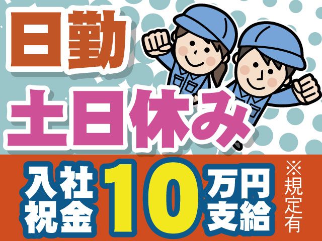 仕事内容 入社祝金10万円支給!※規定有 日勤&土日休み! 20代~50代の男女活躍中 月収例24万円以上可 <具体的なお仕事内容> 工場にて自動車部品に使われる金属製品の、 加工前の段取り作業をお願いします。 下記のような作業となります ・専用機械を操作して、出来上がった 金属部品や砂型を分別してカゴに並べる ・加工前の製品に砂型をセットして、 製品を並べる 入社当日から取り組みやすい簡単作業です。 初めての方も安心してスタートできます。 職場見学OK! お気軽にお問い合わせください <働く環境について> ・髪色自由 ・ピアスOK ・割安な自動販売機有 ・休憩室に電子レンジ、ポット完備 ・個人ロッカー完備 ・仕出し弁当可能 ・パンなどの販売あり ・大き目な工場ですが、各棟に休憩室や 自動販売機が完備で便利 機械オペレーターのお仕事ですが、 未経験から始められるお仕事内容です。 技術を習得したい・スキルアップしたい方にもオススメ! 土日休み&長期休暇もあるので、プライベートも充実!