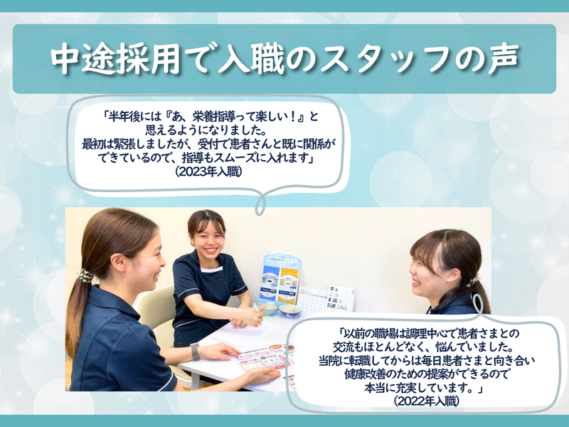 求めている人材 【必須資格】管理栄養士資格 ・栄養指導経験は不問ですが、経験がある方ももちろん歓迎! ・管理栄養士の資格や栄養指導の経験を活かすのに最適な環境です。 \\【こんな方歓迎!】// ・患者さんの健康や自分の夢の実現のために「主体的に学びたい!」向上心がある方 ・地域密着型のクリニックで予防医療に貢献したい熱意がある方 ・明るくコミュニケーションが取れる方 5年後10年後、自分はどのような状態ですか? 当院では一人一人が理想の自分になれるよう 3か月に1回の成長面談をはじめとし、 毎週の1on1面談で成長のサポートをしております。 栄養指導の経験が浅い方でも安心してご応募ください。 「理想の自分」になれるよう成長をサポートします!