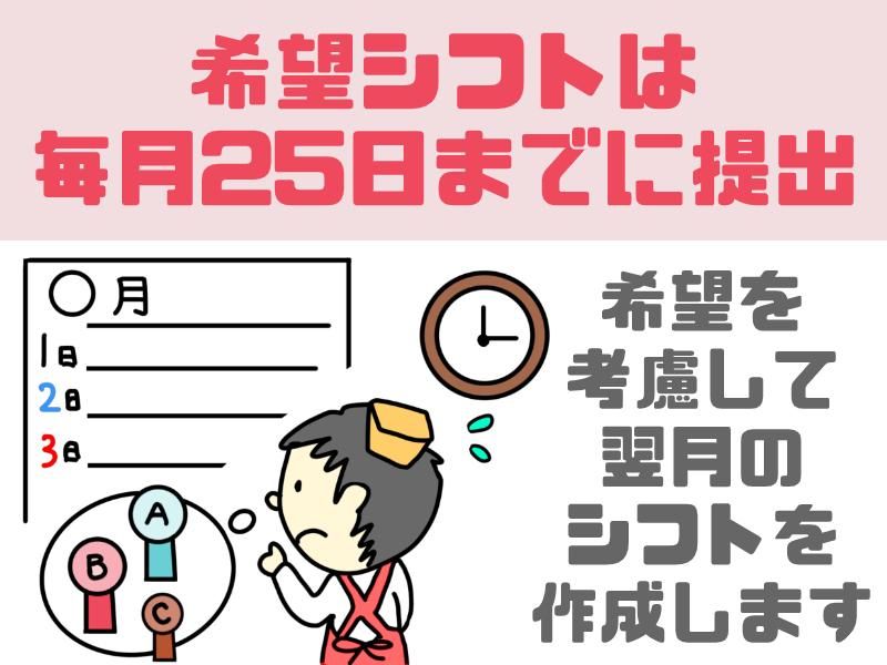 シフト制 勤務時間詳細 16:30~23:15 *週1日~OK *1日3時間~OK! ⇒17:00~/18:00~/19:00~等も相談OK! *16:30より前も勤務OK!(9:00~) ⇒早番帯での勤務時は早番時給適用(時給1200円) <シフト希望考慮します> 毎月25日までに希望シフト提出 ⇒翌月1ヶ月分のシフトを希望考慮し作成 「週5日ガッツリ働く」「授業のない日に」 「本業と掛け持ちで」「副業で収入UP」 「長期休みはたくさん働きたい」など、働き方は自由です! まずはお気軽にご相談ください! ★フルタイムも大歓迎 ★働きやすい!扶養内・WワークOK! ★学業や家事などプライベート優先OK! ★正社員登用制度ありでキャリアアップ可能!