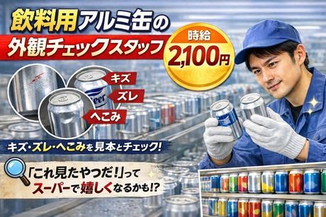 仕事内容 アルミ缶の検査作業 ・仕事内容・ 飲料用アルミ缶の 外観チェック(目視検査) “間違い探し感覚” でできるシンプル作業 出荷前のアルミ缶に 「キズ・印刷のズレ・へこみ」などがないか、 見本と比べながらチェックしていくお仕事です。 難しい作業や専門知識は必要なく、 コツコツ丁寧に確認できればOK/ 「これ違うかも」 そんな“気づける”瞬間は、小さな快感 他の仕事にはない爽快感があって、 やりがいにもつながります。 自分が検査した缶をスーパーで見かけると 「これ見たやつだ」とこっそり嬉しくなることも。 誰にも言わなくても誇らしく感じられる、 そんな“ちょっと特別な仕事”です。 月収例:時給2100円×7.25h×21日=319,725円