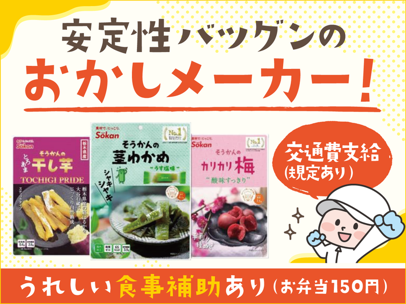 仕事内容 \\会社見学会実施します!!// 応募前にどんな会社か、どんなお仕事か実際に見に来ませんか? 見学だけでもOKです。お待ちしております♪ ◆日 程:4月29日(祝・水)10:00~ ◆場 所:(株)壮関 本社 / 無料駐車場あり ◆持ち物:履歴書(選考を希望される方のみ) ◆申 込: お電話または、メールにてご連絡ください。 【採用担当】0287-48-3301 saiyo@sokan.jp ※申込期限は4月28日(火)17:00までです。 ※別日で見学を希望される方は調整いたしますので、ご相談ください。 -------------------- 【 仕事内容 】 <包装作業全般の業務> *外装包装の作業 (包装機を使用します) *検品作業 ・箱詰め作業等 ・その他付随作業 ※約10~15kgの製品が入ったカゴ等を 積み上げる作業があります。 ※高所での作業があります。 (包装機架台2m程度) ・仕事の内容の変更範囲:会社の定める業務 <安定性抜群> *大手コンビニなどの導入シェア90%以上 *扱う製品はコンビニ・スーパーでよく見る 『茎わかめ』や『干し芋』など *創業30年以上の安定成長企業。 \ 未経験OK /スタートが一緒の方も多数! ちょっと嬉しい食事補助*会社指定の仕出し弁当150円引き! フルタイム歓迎!安定した収入を得られます \社員登用あり/安定収入が叶う! パートスタッフ(準社員)としてご入社 いただき、のちに社員登用も目指せます◎ 場合によっては、社員としての雇用もOK! 面接の際に、これからのことをお気軽に ご相談ください! -------------------- 【 当社について 】 水産加工品、農産物加工品の 製造販売を行う会社です。 [ 年商 ]65億200万円 [ 従業員数 ]363名 [中途採用比率]81%(2023年度) <会社ホームページ> https://sokan.jp/