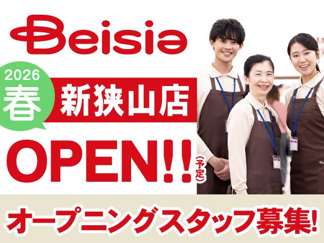 仕事内容 <スーパーの店舗スタッフ/1日3h/早朝> \ベイシアでオープニングスタッフ募集/ ◎2026年春、狭山市にOPEN予定 ◎週3日~、1日3時間の短時間勤務! ◎主婦(夫)の方も働きやすい柔軟なシフト制 ◎高時給1,450円! ◎髪色髪型自由! ◎午前中のみなのでスキマ時間で稼げる! ◎学生さんのバイトデビューもOK ◎未経験OK ◎ブランクOK ◎副業先お探しの方にも最適 ・2026年春OPEN(予定)のきれいな新店舗 オープニング募集なので皆同じスタート ・学生/フリーター/主婦(夫)・ママさんなど ベイシアの各店舗では 10~40代50代の幅広い年齢層の方が活躍中! 【募集職種】 アルバイト/早朝作業(ネットスーパー) <主なお仕事内容> 注文商品の店内ピッキング・梱包作業 など 【未経験からのスタートが多数】 オープン前に事前に近隣の店舗で研修があるため、 未経験の方や業務が不安な方もゆっくり仕事を 覚える時間があるので、ご安心ください! 先輩スタッフもそばでしっかりサポートするので 何か困ったことがあればいつでも相談できますよ 【オープニングのため大量募集中!】 ただ人気の曜日や時間帯から埋まっていくため、 少しでも興味のある方は早めにご応募ください。 オープン前から研修として勤務開始できるので 入社日はお気軽にご相談ください! もちろん研修時も正規時給をお支払いします。 【職場環境】 ベイシアのパートさんは、 どの店舗でも女性・主婦(夫)さんが 多数活躍中です!(男女比:2:8) ママさんが多くみんなで 力を合わせて頑張っています! 今回のオープニング店も 30代・40代・50代の主婦(夫)さんが 多く集まることが予想されます! \ベイシアで働く方の口コミ/ ・ベイシアの商品は安いのに高品質。 Low costな食品やお惣菜、 日用品をお仕事終わりに買い物して 帰ることができるので、家事も時短になり、 主婦にとってすごく便利です! ・50代からの久し振りの パート復帰でしたが、 みなさん優しく教えてくださり、 居心地の良い職場です。 ・同世代の主婦さんが多く、 40代から気の合う友達もできたりと、 パートに通うのがすごく楽しいです!
