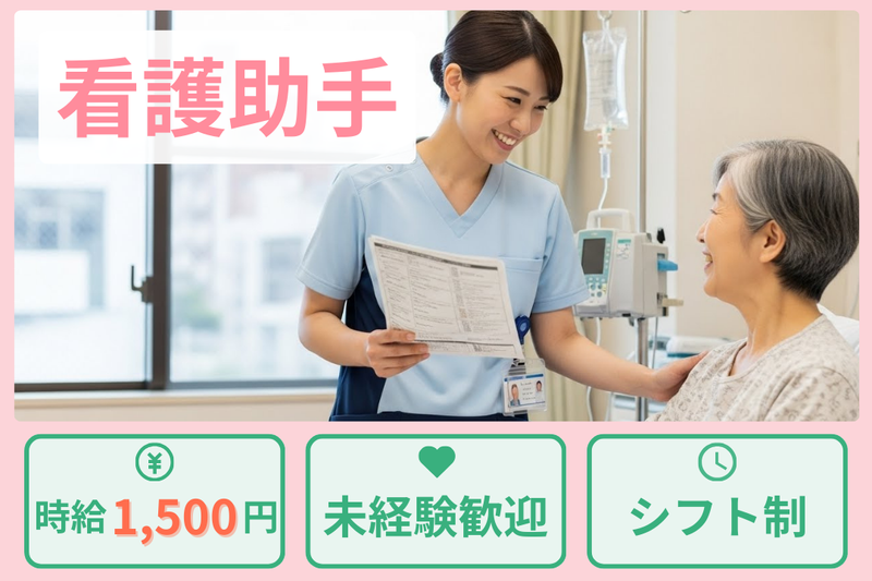 仕事の内容 【時給1500円×日払いOK】 \未経験から病院ワークデビュー!看護助手スタッフ/ 資格も経験も一切不要! ルーティンワーク中心で、安心して始められるお仕事です。 病院内で、看護師さんのサポート業務をお任せします。 20代から50代まで、幅広い世代の男女スタッフが活躍中! 高時給&日払い対応で、しっかり稼ぎたい方にもピッタリです✨ 【お仕事内容】 ・病室の清掃、ベッドメイキング、備品管理 ・患者さまの移送サポート、身体介助(おむつ交換等) ・検体や薬剤などを運ぶメッセンジャー業務 ・ナースコールや電話の対応 など 【ここがポイント】 ✅ 時給1500円スタート!交通費も全額支給 ✅ 日払い・週払いOK!急な出費も安心です ✅ 日曜・祝日は固定休み!有給休暇も推奨 ✅ 資格取得支援あり!働きながらスキルUP可能 ご応募を心よりお待ちしております✨ お問い合わせの際には下記【お仕事No】をお伝えください。 お仕事No:129079