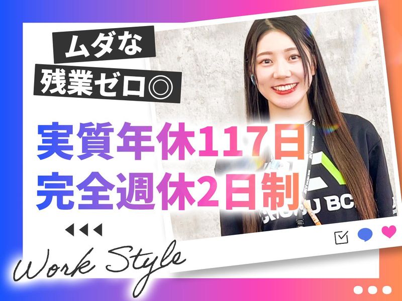 勤務時間詳細 総労働時間:1週あたり40時間 勤務時間:9:00~18:00 (休憩時間 1時間) 【基本的に無駄な残業は一切なし!】 メリハリをつけて働くことができます。