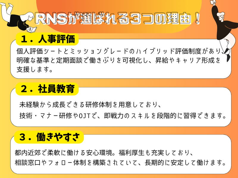 仕事内容 採用サイト、公式SNSもやってます! 職場の雰囲気が気になる方は、ぜひのぞいてみてください。 ○。.○。.○。.○。.○。.○。。.○。.○。 ■採用サイト:https://sites.google.com/view/rns-recruit-site/ ■YouTube:https://www.youtube.com/@RNS_recruit_RNS ■Instagram:https://www.instagram.com/realnetsystem/ ○。.○。.○。.○。.○。.○。。.○。.○。 お客様とユーザー様の架け橋となる IT事務・保守運用・サポートデスク全般 ※IT業界とは無縁の20~30代が活躍中 【具体的には】 金融・物流系の大手企業にて ◎顧客従業員やユーザーからの問合せ一次対応 ◎申請内容の確認など一般事務関連業務 …このような幅広いIT事務・ヘルプデスク、サポートデスクをお任せします。 その他業務に慣れていく中で RPAの設計や、アプリ開発(ノーコード)など、 様々なプロジェクトに参画する事が可能。 (WinActor、PowerAutomateなどを使用) どの案件もマニュアルが揃っている為、 IT関連の知識や経験が全くなくて大丈夫! すぐ業務に慣れる事が出来ます。 また、頼れる先輩が必ず複数いるので、 分からないことや疑問点は質問して解決できるし、 自分が気づいていない強みを見つけ、伸ばしてくれたり、 自分の成長を後押ししてくれるサポート体制も魅力! さらに、常駐先にずっといる不安を解消する為の 「社内プロジェクト」が数多くある点も見逃せません。 至れり尽くせりの環境の中、 IT業界の知識を身に付けませんか? ★☆業務遂行に必要なため、日本語ネイティブレベル(読み書き・会話)が必須です☆★ 『社内外のコミュニケーションはすべて日本語で行います』