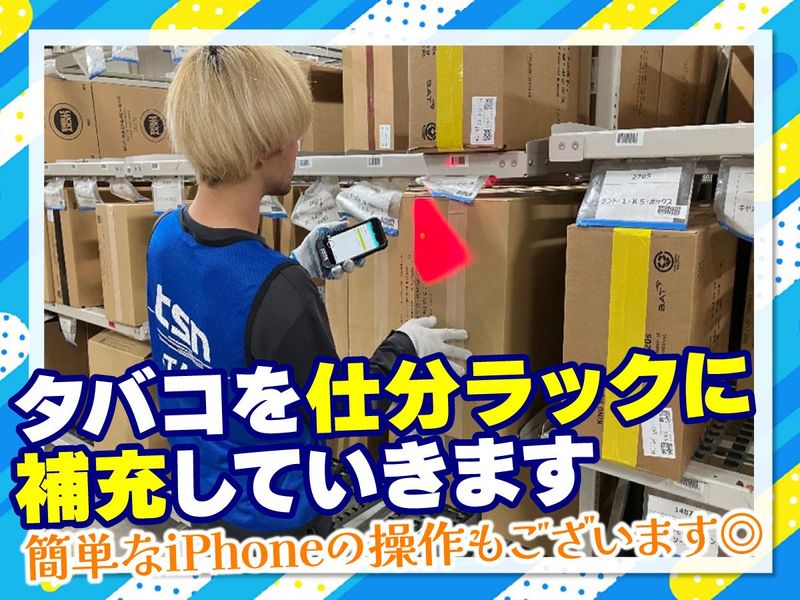 仕事内容 ✅冷暖房設備の大きくて綺麗な倉庫! ✅昼から勤務で朝はゆっくりできる♪ ✅プチボーナスや有給など福利厚生◎ ✅車・バイクOKで通勤らくらく♪ <具体的には> タバコ(段ボール単位)の 整理・補充作業をお願いします。 ハンドリフトやパレット(荷物を載せる板)使用し、 タバコ(段ボール単位)の整理、大きなラックに製品を補充するなど様々な作業があります。 基本的にはひとりでモクモク作業! 馴れれば簡単な作業♪ 作業スペースが限られており、その中でタバコ(段ボール単位)の整理や製品の積付け、仕分ラックへの製品補充をします。 シンプルな作業なので、誰でも安心して作業を始められますよ! スマートフォン(iPhone)の操作もありますが、先輩がやさしく指導してくれるのですぐに扱えるようになりますよ♪ ※段ボールの重さはおおよそ18kg前後 <TSネットワーク株式会社について> 国内のたばこ流通シェアは99%以上!! 全国の店舗にたばこをお届けするために 必要不可欠なお仕事です◎ 大手JTグループという基盤があるため 安定した環境で長く働けますよ♪ ▼ホームページ https://www.tsnk.co.jp/