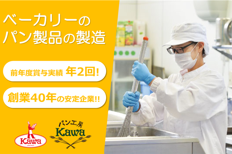 仕事の内容 【アピールポイント】 ・創業40年目を迎える安定企業! ・賞与年2回あり! ・将来管理職候補としての活躍も可能! 当社は、和歌山・大阪を中心に 「パン工房Kawa」「川珈琲店」 「Boulangerie Kawa」の3業態を展開。 創業以来、『私たちが美味しいと思わないものは 絶対に作らない』という信念のもと、 心をこめて日々パン作りを行っています。 【お仕事内容】 ベーカリー店舗に納品するパンの 製造に係わる業務・清掃を行っていただきます♪ ◆ココが面白い!! 従業員は皆、それぞれの持ち場で 「カワの味・品質」を作り上げていきます。 その行程はマニュアル化されてはいるものの、 作業の一つひとつにマニュアルに記載されていない スタッフ一人ひとりの愛情も込められています♪ ◆キャリアについて 技術や知識が身に付くことができ 自己成長に繋がります。 またゆくゆくは管理者としても活躍可能! あなたのキャリアアップの可能性は無限です。 ★カワで働く時に大切なこと★ 製造をしたことがなくても未経験者大歓迎です! 人と話をすることが好き、パンが好き、 そんな「好き」な気持ちが大切です! 1,食べることが大好きで「食」の世界に興味がある人 2,相手の立場になり「返事」や「挨拶」の大切さがわかる人 3,「失敗OK!」積極的に挑戦する気持ちが持てる人 4,One for All, All for One!!「明るく元気にきびきびと」行動が出来る人 私たちは、店舗の仲間、会社組織、地域社会、 様々な人と関わり、生活を共にしています。 一人ひとりがみんなのために、みんなが一人ひとりのために、 「相手」を想いやり行動することで、 ようやく、ご来店いただけるお客様に 「喜び」や「感動」を与えられると思います。 こちらの4項目の大切さに「共感」いただけるなら、 是非、カワのフィールドで働いてみませんか。