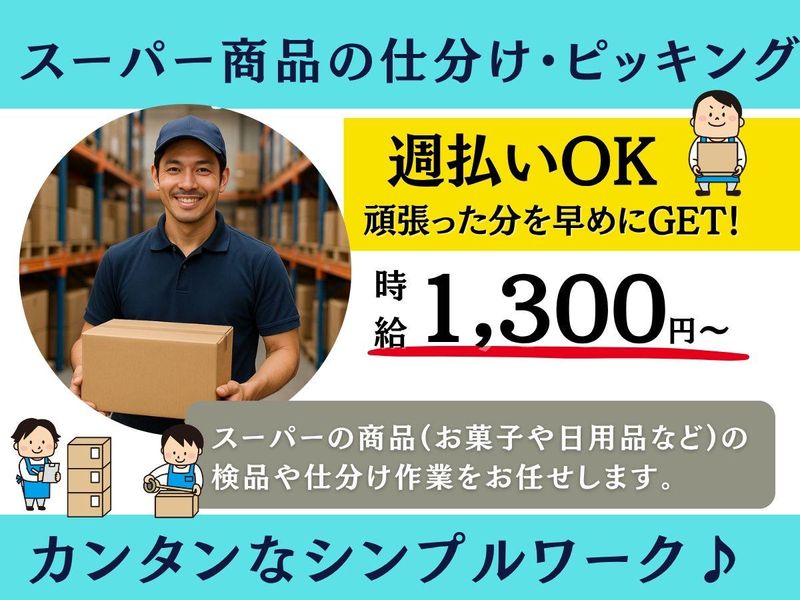 仕事内容 無資格・未経験からスタートできる スーパー商品の 仕分け・梱包スタッフの募集です! 常温倉庫内でのオシゴトです。 【Point】 ✨週払いOK ✨髪型・髪色自由 ✨20~40代男性活躍中 ✨「完全週休2日制」 【具体的には】 ✅ 各店舗へ出荷する 商品のピッキング (ハンディーを見ながら商品を集める) ✅ 商品の仕分け・数量確認 ✅ 箱詰め・梱包・ ラベル貼りなどの出荷準備 どの作業も難しい手順はなく、 慣れてしまえばスムーズに こなせるシンプルなお仕事です。 現場では社員や先輩スタッフが しっかりサポートしてくれるので、 未経験の方も安心してスタートできます! ※人気なご案件になりますので 充足次第募集を終了させていただきます!