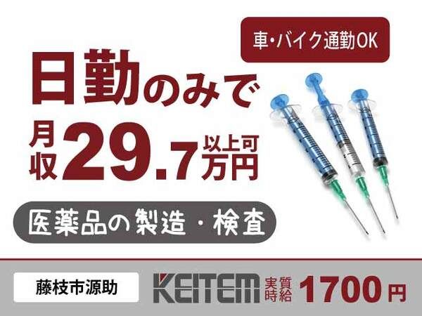 仕事内容 【医薬品の製造・検査】 注射の薬液など医薬品を製造している工場です。 下記いずれかの作業をお願いします。 ▼作業内容 ・材料をあわせて薬液の製造 ・容器に薬液を詰める ・完成品が企画通りか検査 ・箱詰めなど梱包作業 【求人担当者からヒトコト】 医薬品を製造しているだけあって、清潔な工場です。 空調も完備されているので快適に働けます! ・。'.・。'.・。'.・。'.・。'.・。'.・。'.・。 ◆ おすすめポイント ◆  ̄ ̄ ̄ ̄ ̄ ̄ ̄ ̄ ̄ ̄ ̄ ̄ ̄ 【医薬品の製造・検査】 『未経験から実質時給1700円!』 #日勤のみ #薬液の製造 #男性活躍 #月収29.7万円以上可 #土日祝休み #車・バイク通勤OK #日払い可 #残業月10時間程度 #クリーンルーム ・。'.・。'.・。'.・。'.・。'.・。'.・。'.・。 ◆ 職場環境について ◆  ̄ ̄ ̄ ̄ ̄ ̄ ̄ ̄ ̄ ̄ ̄ ̄ ̄ ▽クリーンルームでのお仕事です 空気中のゴミやホコリの侵入を防ぐため、 クリーンスーツ(防塵服)を着用します。 室内は温度が一定に管理されているので、 年中快適にお仕事していただけます。 ・。'.・。'.・。'.・。'.・。'.・。'.・。'.・。 ◆ 採用担当よりPR ◆  ̄ ̄ ̄ ̄ ̄ ̄ ̄ ̄ ̄ ̄ ̄ ̄ ̄ (1)高時給1600円!さらに皆勤で時給+100円! (2)10~30代の男性スタッフが活躍中 (3)働きやすい日勤のみ&土日祝休みです ・。'.・。'.・。'.・。'.・。'.・。'.・。'.・。 ◆ 業界未経験者大歓迎 ◆  ̄ ̄ ̄ ̄ ̄ ̄ ̄ ̄ ̄ ̄ ̄ ̄ ̄ 以下の業界での勤務経験のある方も活躍中! ・自動車整備業界 ・物流・運輸業界 ・飲食業界 ・小売業界 ・サービス業界 ・アミューズメント業界 ・インフラ業界 ・ホテル業界 etc. ・。'.・。'.・。'.・。'.・。'.・。'.・。'.・。