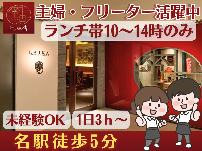 仕事内容 《ランチタイムに働ける方大歓迎!!》 ⭐美味しいまかない、制服支給、 頑張り次第で時給UP⭐ 掛け持ちバイトや学業、 子育てとの両立がしやすい 《1日3時間程度》 【駅近×⾃分らしく働ける・接客が好きなあなたにピッタリ!】 飲食店が初めての方、 ブランクがある方でもOK♪ 1から丁寧に教えます。 是非興味がある方はまずはお問合せ下さい。 名古屋駅より徒歩10分圏内 《來杏(ライカ)ChineseRestaurant》 看板メニューの担担麺や 人気の麻婆豆腐、炒飯なども もちろんまかないで食べられます♪ 笑顔で明るく接客が好きな方を大歓迎しています◎ フリーターや学生、主婦さんも活躍中! 一緒に働いてみませんか? ⏩“家庭優先”の働き方ができる◎ 家事の合間に、子どもが帰る迄の時間で、 ”家庭を大切にしながら働きたい” そんなあなたを応援します◎ 忙しい毎⽇の中で、無理なく働きたい方 「家庭」と両⽴できる仕事を探している方 アットホームな雰囲気で働きたい方を大歓迎します♪ 私達と一緒に働きませんか? ⭐この求人の3つの魅⼒⭐ ☝ 週2‧3⽇〜、平日のみ・土日のみOK!短時間勤務◎ プライベートの予定と両⽴しやすいシフト制、 お子様のスケジュール優先、家庭第一、学業優先で働けます。 学校に行きながら、定時制の学生も活躍中! ☝ブランク有でも安⼼のサポート体制 社員とペアで⼀から丁寧に指導 久しぶりのお仕事復帰で不安な方や ハンディーやレジが初めてでもOK✊ 基本から教えます。 ☝ アクセス抜群の好⽴地 名古屋駅から徒歩10分圏内 通勤ストレスなく、帰りも安⼼♪ ――――――――――――――――――― ■ 仕事内容 ――――――――――――――――――― ・オーダー取り、レジ ・料理・ドリンクの提供 ・洗い物・テーブル片付け ・洗い場での皿洗い など ――――――――――――――――――― ■ 勤務地 ――――――――――――――――――― 「名古屋駅」から徒歩5~10分圏内 駅チカで通勤も便利です♪ 來杏(ライカ) Chinese Restaurant 名古屋市中村区名駅4-24-8 いちご名古屋ビルB1F ――――――――――――――――――― ■ ブランクのある方も大歓迎! ――――――――――――――――――― 久しぶりのお仕事復帰も応援します! 実際にお仕事復帰の場として 当店を選んでくれたスタッフさんも多く、 しばらくお仕事から離れていた方の 不安な気持ちも理解しています◎ 安心してお仕事がスタートできるように 先輩がしっかりとサポートします♪ ――――――――――――――――――― ■ 活躍中のスタッフの声 ――――――――――――――――――― 家計の足しに、と思い働き始めました! 子供の塾代にあててます。 子どもを迎えに行くまでの短時間で 働けるので、帰りに夕飯の買い物をして そのままお迎えに行って帰宅します。 私の生活リズムにピッタリで とっても働きやすいです! 面接も堅苦しくなく、リラックスして 話せたのが印象的でした! ………………………………………………… お電話でのお問い合わせも大歓迎! TEL:052‐571‐2278(水野まで) …………………………………………………