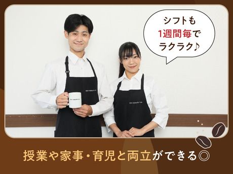シフト制 勤務時間 ・勤務曜日:月・火・水・木・金・土・日・祝 ・勤務時間: [1] 07:00~22:00 ★週3日以上・1日4h以上~OK ★モーニングタイムは特に大歓迎中! - ◇◆ スタッフの働き方一例 ◆◇ < フリーターStaff >週4~6日、フルタイム勤務。 < 学生Staff >授業やサークルの予定に合わせて曜日ごとに勤務時間を変えています! < 主婦Staff >日中勤務。家事の合間でお仕事◎ -