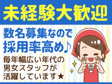 職場環境 【従業員構成】 20代・30代・40代・50代・60代の高校生・大学生・主婦(夫)・フリーター・シニア・中高年など幅広い年代のスタッフが活躍中! 【職場の雰囲気】 落ち着いた職場 個性が活かせる 業務外交流少ない 立ち仕事 アットホーム お客様との対話は少ない 初心者活躍中 自分の都合に合わせやすい 知識、経験不要