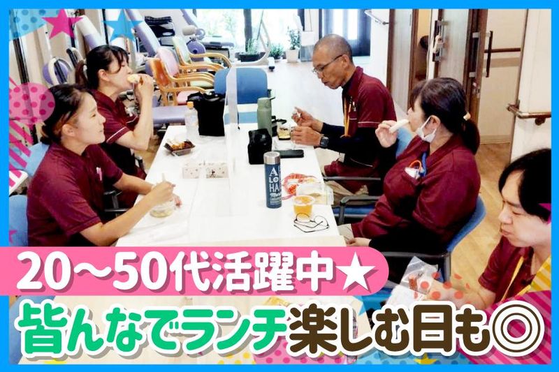 職場環境 *介護予防を目的とした、スポーツクラブのようなデイサービス* 20~60代の男女スタッフが10名在籍。中高年活躍中! 福祉業界経験者からセカンドキャリアとして未経験で始められた方まで 明るく気さくなスタッフが揃っており、 新人さんも馴染みやすいですよ♪