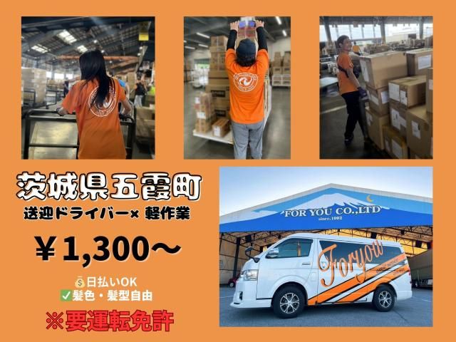 茨城県五霞町/送迎ドライバー×軽作業/土日祝休み/11時~の勤務/勤務日数応相談/普通免許でOK/
