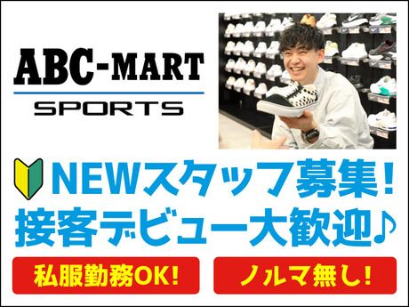 仕事内容 <具体的には> 店舗での販売のお仕事をお願いします。 ◆お客さまへの接客やご案内、レジ業務 ◆商品の整理や補充、店内の清掃 ◆シューズに合った オシャレなディスプレイや コーディネートなどの店舗づくり etc. 最初は簡単な作業からスタートし、 徐々に店舗の雰囲気に慣れていってくださいね◎ ★シフト自由★短時間ワークもOK! 週3日、1日4時間から働けるので プライベートの予定も立てやすいですよ♪ 授業やサークルのない日だけ働きたい学生の方、 家事の合間に働きたい主婦の方、 また、かけ持ちで働きたいフリーターの方など、 さまざまな方が活躍中です◎ 平日のみ、土日のみ、 扶養範囲内での勤務など、 シフトの相談もお気軽にどうぞ! ★未経験OK★バイトデビューも大歓迎♪ エービーシーマートでは 特別な経験やスキルは不要です! 商品のことやお客様への話し方など 丁寧な研修がありますので、 未経験でも安心してスタートできます。 それに、親しみやすくて 面倒見が良い先輩ばかりなので 困ったときはすぐに相談できますよ! 仕事の後にはみんなで一緒に食事に行ったりと 仲の良さが特徴のお店です♪ ★社員登用制度あり★キャリアアップも可能です! 将来社員として働きたい方も大歓迎! ABCマートではアルバイトからスタートし 社員になった先輩がたくさんいます! 販売の仕事だけでなく、 将来はバイヤーやプレスなどへの キャリアチェンジも可能です! あなたのセンスやスキルを活かせる 大きなフィールドが広がっています! ABC-MART SPORTS とは? ABC-MARTの新しいブランドです♪ 日常生活にスポーツを取り入れ、 より快適で健康的なライフスタイルを実現するため、 街着でもアクティブに楽しむために、 スニーカーだけでなく、トータルファッションで スポーツアイテムを提案しています。 一緒に、楽しくてカッコいい スポーツの世界を作っていきませんか!