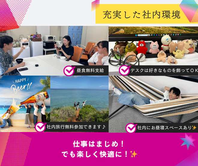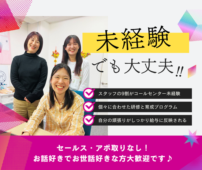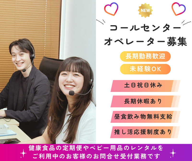 仕事内容 「コールセンターって大変そう…」 そんなイメージ、ここでくつがえします! ✅ 駅チカで通勤ラクラク♪ ✅ 残業なし!定時で毎日ピタッと退社 ✅ シフト・服装・髪色ぜ~んぶ自由! ✅ 土日祝休みでプライベートも超充実 ✅ 優しいクライアントだからプレッシャーゼロ ✅ トークマニュアルを読むだけで未経験でも安心 「働きやすさ」も「楽しさ」も、ぜんぶ叶えたい! そんなあなたにピッタリの職場です☆ ☆オフィスワークの常識が変わる!?自慢の福利厚生 ☆ 当社の自慢は、なんといってもスタッフ想いの手厚い福利厚生! ◇ランチは毎日無料支給! お財布に優しく、お昼の心配もいりません。 ◇もちろん、ドリンクも飲み放題! 仕事中の一息に、お好きな飲み物をどうぞ。 ◇アルバイトも無料!楽しい社員旅行 オンもオフも楽しめる、仲間との一体感が自慢です。 ◇頑張りはしっかり評価!昇給制度 (入社3か月で時給60円UPの実績あり!) ──────【 お仕事内容 】────── ベビーレンタル用品、インフルエンサープロデュースのコスメ、サプリなどの健康食品に関する、お客様からのお問合せ対応をお任せします。 ① 未経験でも心配いりません! お一人お一人に合わせてOJTを行います! 難しい内容や、困ったことがあれば先輩が即フォロー!アポイント取得などの営業要素も一切ありません。 ② あなたのペースで成長できる! まずは一つの分野から専属で担当していただきます。あなたの個性や適性に合わせて分野を決めるので、無理なくスタートできます。 ③ ノルマ・プレッシャーとは無縁です! お取引のあるクライアントは、とても優しい方ばかり。円滑にやりとりができるので、ストレスなく業務に集中できます。 ☆働きやすさのヒミツは、ここにあり!☆ 【プライベート最優先でOK!】 完全土日祝休みで、GW・お盆・冬季の長期休暇もしっかり取得可能!残業もないので、仕事終わりの予定も立てやすいですよ。 【子育て世代も応援します!】 お子様の急な体調不良や学校行事など、シフトは柔軟に対応しますので、お気軽にご相談くださいね。(条件あり) 【自分だけの快適空間!】 デスクは1人1卓をしっかり確保!好きなキャラクターのグッズを置いたり、使いやすくカスタマイズしたり…あなたの「お城」を作ってください♪ ▼∴▼∴▼∴▼∴▼∴▼∴▼∴▼∴▼ ほとんどの先輩が未経験から活躍中! 新しいことに挑戦したい方、 自分らしくイキイキと働きたい方、 ぜひ、私たちと一緒に働きませんか? あなたからのご応募をお待ちしています! ▼∴▼∴▼∴▼∴▼∴▼∴▼∴▼∴▼
