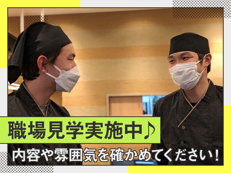 選考プロセス ご応募 ▼ 面接(1回) ▼ 内定 ※面接日時・勤務開始日はご相談に応じます。 <職場見学実施中> ホール・キッチンの仕事を見るだけでなく、 実際にお寿司を作ってもらう体験もあり! その後先輩スタッフへ質問できる時間も設けています。 面接前に直接、仕事内容や職場の雰囲気を確かめてください!