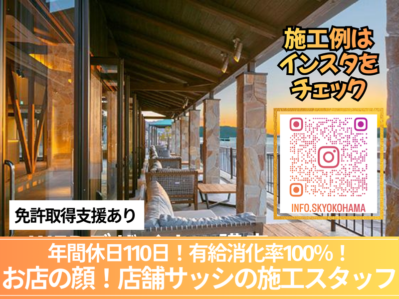 仕事内容 \有給消化率100%×未経験歓迎/ ストアフロント製作スタッフ募集! ◆―――――おすすめポイント――――◆ ✨ 2023年以降ずっと有給消化100%! ✨ 社労士の代表が制度改革 → 働きやすさが段違い ✨ 未経験でも“プロの技術”が身につく ✨ 国家資格取得OK(取得支援あり) ✨ 30代40代が中心となり活躍中 ✨ 即日採用の可能性あり ✨ 気になったら電話応募もOK! TEL:045-783-6184 ◆―――――――――――――――――◆ 2023年以降、有給消化100%になりました。 背景には2023年に就任した現代表が 社会保険労務士(社労士) であることが挙げられます。 顧客満足度を重視しながらも、 より従業員ファーストな体制に! という強い意志で制度改革を行い、 現状の有給消化率100%を実現しました。 これからもより働きやすい会社を目指し アップデートを続けていきます。 ✨具体的なお仕事は ドラッグストア、コンビニエンスストア、 スーパー、アミューズメントパークなどの ストアフロント(店舗用サッシ)の 製造・施工業務をお任せします。 施工例はInstagramをチェック! ✅@info.skyokohama 【未経験の方も安心の育成サポート】 当社は未経験入社が多数。 「最初の不安」を知っている先輩が 多いからこそ、補助作業から段階的に 成長できる教育体制を整えています。 「背中を見て覚える」指導は一切なし。 作業の流れ・道具の使い方・ 現場での立ち回りまで、 基礎から丁寧にお教えします。 また、自動車免許の取得支援制度や、 国家資格「自動ドア施工技能士」の 取得支援も行っており、 一人前の職人を目指せる環境です。 【積極的に学べる方を歓迎します】 言われた作業をこなすだけではなく、 自分から新しいことに挑戦する 意欲的な姿勢を歓迎しています。 とはいえ、すぐに1人前にはなれません。 独り立ち迄は約5年を想定しており、 技術は一朝一夕では身につきませんので 日々コツコツ積み重ねていきましょう。 【ほとんどが未経験スタート】 施工チームは20〜30代が中心。 チームリーダーも未経験スタートでした。 地道に学び続けた結果、 今では工事部長として活躍しています。 自分が調整・施工した設備が 店舗で動く瞬間は、 大きな達成感とやりがいにつながります。 小規模な現場は若手、 大型の現場はベテランが担当しつつ、 いずれも“チームで協力”して進めます。 相談し合いながら現場を形にしてきます。 【大切なのはコミュニケーション】 チームで行う仕事なので、 わからないことは何でも聞いてください。 面倒見の良いメンバーばかりで、 丁寧にサポートします。 失敗を恐れず挑戦してほしい―― あなたの成長は全員で支えます。