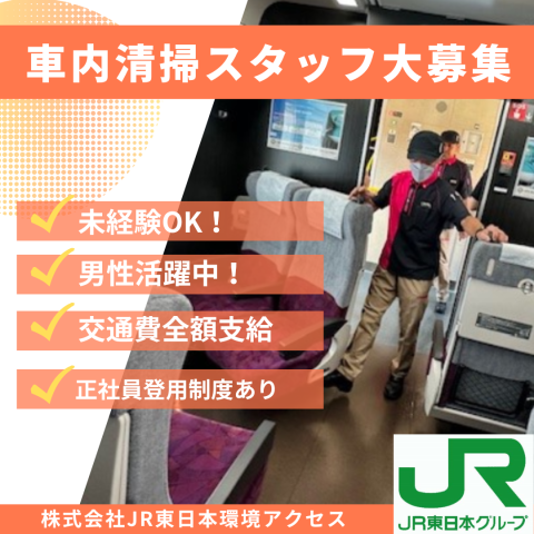 JRの折り返し列車の清掃業務/中央線グリーン車導入に伴う新規スタッフ募集!/男性活躍中!/未経験歓迎 パート お任せするのは、JR駅での折り返し列車の清掃全般。担当によって業務が若干異なります。丁寧な研修もあるので、未経験歓迎♪ 勤務は営業時間内でシフトによります。 プライベートと両立させながら、安定した収入を確保しませんか? 職場は事業所が担当している駅になります。アクセスは抜群◎ 交通費全額支給で、ご自宅から通える範囲の勤務地から選べます。 首都圏に多数勤務候補地あり。 当社はJR東日本グループの一員。 充実した福利厚生制度が揃っているのも自慢です! シニア世代・シルバー人材活躍中、定年後に活躍できる職場です! 各世代、若手も含め活躍中です。