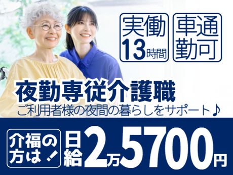 仕事内容 ■住宅型有料老人ホームにおける夜勤専従介護業務全般 ※夜勤体制:ご利用者様20名につき、介護士1名体制 ※休憩回しのスタッフがいるので、しっかり休めます ※平均介護度低め <主な業務> 【身体介護】 ・食事介助、排泄介助 ・移乗介助、更衣介助 など 【生活援助】 ・清掃、洗濯、ベッドメイク ・食事の配膳下膳 など 【介護記録作成】 ・スマートフォンを使用 <お仕事の1日のスケジュール例> 17:00~ 出勤、申し送り、業務分担表確認 18:00~ 夕食:食事の配膳、下膳などの食事介助 20:00~ 就寝介助:更衣、トイレ誘導、排泄介助 22:00~ 夜間帯の見回り、介護記録作成、コール対応 05:00~ 早朝の見回り、介護記録作成、コール対応 07:00~ 起床介助:更衣、トイレ誘導、排泄介助 ~09:00 介護記録記入、申し送り、退勤 <派遣先> 全29室住宅型有料老人ホーム ※平均介護度が低めで、身体的負担が少ない施設です <受動喫煙対策> あり(屋内禁煙) ここがポイント ■日給2万5050~2万5700円 ■17:00~翌9:00(実働13時間)勤務 ■ご利用者様20名に対し、介護士1名体制 ■休憩回しの方がいるので、しっかり休めます ■週2回~相談OK! ■時短勤務相談可(週20時間以上) ■入浴介助などそれぞれで業務分担を実施!残業ほぼナシ