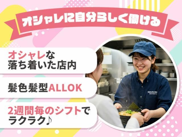 アピールメッセージ 【オープニング大募集】\肉そば屋でバイトしよ/高時給で稼げる!短時間・即払いOK★髪色自由 2週間毎の自己申告制シフト♪子育て優先のしゅふさん、学業優先の学生さんなど、スキマ時間で効率よく働きたい方にもピッタリ!