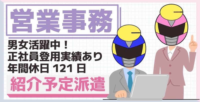 応募資格 20代・30代の男女活躍中! 営業事務経験がある方 タッチタイピングが出来る方優遇! パソコン業務が苦じゃない方にオススメ♪ 問わない