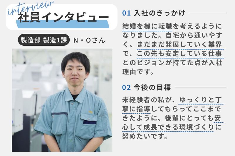 【仕事内容】 \未経験から最先端技術を習得できる/ 超精密部品の工場作業員を正社員募集! ※応募条件※ ・40歳未満の方(例外事由3号のイ) ・高卒以上 【工場作業員の仕事内容】 ◆材料の検査/在庫管理 ┗加工前に素材の品質検査を行い、必要な材料を管理 ◆自動旋盤機械の操作(機械加工) ┗工具を設置し、最適な削り方を調整することで、高品質な製品を作成 ┗加工に必要な工具の制作や点検整備 「自動旋盤機」を使い、金属や特殊素材を加工するお仕事です 設計や機械操作、加工を一貫して担当し、徐々に自分の手で製品を作り上げていきます \充実のサポート体制/ 未経験からでも安心してスタートできる環境です 経験豊富な先輩たちがしっかりフォローし、イチから丁寧にお教えします 外部研修もあり、少しずつ自分のペースで学びながら着実に技術を習得していきましょう 【オススメPOINT】 ■プライベート充実 《週休2日制》土日祝休み リフレッシュできる休暇が充実しており、仕事の効率もアップします 有給消化率66.3%(2023年)、自分のペースでしっかり休める環境です ■残業少なめ 月平均残業時間は、5.19時間(2023年) 仕事終わりの時間に趣味やご家族との時間も十分に確保できます ■定着率抜群の働きやすい職場 離職率が6.1%(過去5年平均/定年退職者は含めず) 社員旅行や忘年会など、リラックスした場での交流があり、 日常的に相談しやすい環境が整っています 【株式会社ウィルについて】 当社は、超精密な電子部品を製造する会社です 電子機器や医療など、幅広い分野で使用されており取引先との関係を拡大中! 当社の工場作業員にぜひお気軽にご応募ください!