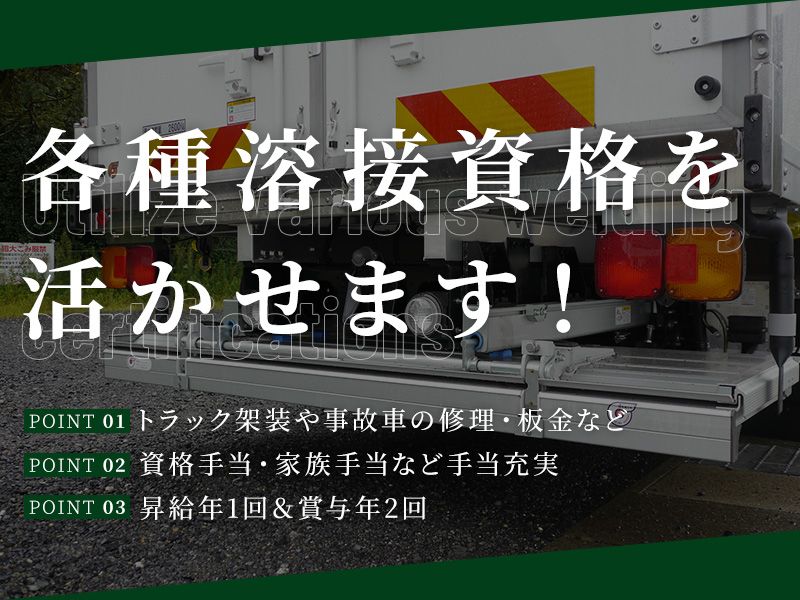 仕事内容 物流の基盤を支える、誇れる仕事! 【溶接や鈑金など車体加工の製造スタッフ】 ‥‥‥●働く魅力は?●‥‥‥ ✅平均年齢33歳!若手活躍中✨ ✅賞与2回(計2~5ヶ月分の実績) ✅土日祝休み×長期休暇あり ✅福利厚生も手当もバッチリ! ✅資格取得支援あり ‥‥‥●どんな仕事?●‥‥‥ トラックの荷台やフレームをはじめ、 クレーン・油圧装置の架装、 事故車の修理(鈑金、塗装)など行います! 【 具体的な仕事内容 】 1|荷台やフレームの溶接 2|クレーン・油圧装置の取付 3|事故車の鈑金・塗装修復 4|各種パーツの組立・調整 5|仕上げ確認・最終調整