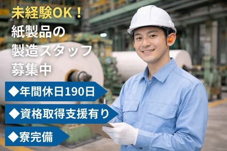未経験から始められる紙製品製造。6人チームでOJTあり、サポート体制も万全。年間休日190日、資格取得支援ありで安定して長く働けます。