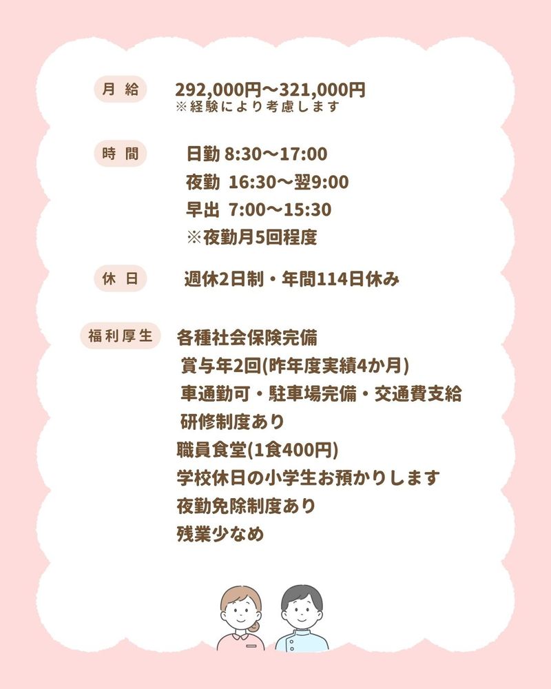 メッセージ ●託児所あり! ●子育てママさん活躍中 ! ◇24時間託児所完備 (0歳児より。夜間は1歳児から) ◇託児所利用児への給食提供 ・昼食(おやつ付) 230円 ・夜勤時の夕食+朝食 400円 ・遅出勤務時と18時以降の残業時はおやつ提供あり ●学校休日の小学生をお預りします (※定員等の条件あり) ●プリセプター制度もあり、 経験の浅い方でも安心して働けます! ※「プリセプター」とは、 主に看護師が新人看護師(プリセプティ)に マンツーマンで指導・育成を行う先輩看護師のこと ●ブランクがある方も大歓迎! 充実の研修、教育体制でしっかりとサポート! スキルアップもできる環境です! ●チーム医療の一員として あなたをお待ちしています ▽▽▽▽▽▽▽ ☆こちらのお仕事は、 企業様からお預かりし 転職エージェント『しごと計画学校』が ご紹介するお仕事です 山口県周南市の温泉地、湯野にある病院での看護師募集! 職業紹介事業(33-ユ-300208) 労働者派遣事業(派33-300443)