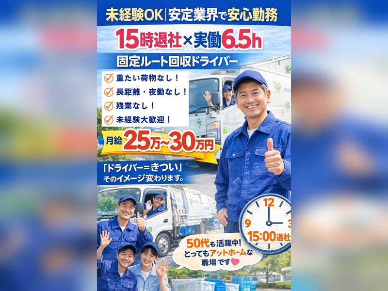 仕事内容 【未経験大歓迎!】 \7:30〜15:00|月給25万円〜30万円!・完全週休2日制!・長距離なし・日勤(実働6.5h)の固定ルートで回収を行うお仕事/ \“働きやすさ重視”の方に選ばれています/ ✔ 15時には仕事終了 ✔ 実働6.5時間(7時30分〜15時) ✔ 重たい作業なし 「ドライバー=きつい」のイメージが変わります! ⸻ 【仕事内容】 各家庭や施設を回り、決まったルートで回収を行うお仕事です。 〈回収するのは〉 ・ビン ・カン ・ペットボトル など ⭐️重たい荷物はありません! →夜間回収・長距離運転は一切なし! 7時30分〜15時 \残業は渋滞時を除いてほぼありません!/ 「道を覚えるのが苦手…」→ 固定ルートなので、自然と覚えられます! ⸻ 【給与】 〈月給25〜30万円〉 週休 制:30万円 完全週休2日制:25万円 ・ 安定した仕事量 ・ 景気に左右されにくい業界だから長期で安心して働ける! ⸻ 【勤務時間】 7:30~15:00 ◎1日の実働は6.5時間!(休憩1時間) ◎渋滞時を除き残業ほぼなし! \\\月平均時間外労働5時間!/// ⸻ 【休日・休暇】 ⭐️〈日曜日・年末年始・有給休暇等〉 ・完全週休2日制or週休制選べます! ・もう1日はシフト制でお休み! ・ご希望があればご相談ください! ⸻ 【福利厚生】 ・昇給あり(社内規定あり) ・賞与あり(年2回) ・免許取得支援制度(全額会社負担!)※社内規定あり ・備品支給 ・制服貸与(社内規定あり) ・交通費支給(社内規定あり) ・愛車手当 ・無事故・皆勤など各種手当あり! ⸻ ✨【未経験でも安心な理由】 ・入社後は先輩が横に乗って丁寧に指導! ・ルート・作業手順を一からレクチャー ・未経験スタートのスタッフも多数活躍中! \異業種からの転職、社会人経験が浅い方も大歓迎です!/ ⸻ \\\条件が合わなくてもご相談ください!/// 【こんな方におすすめ!】 ・完全週休2日制! ・プライベートと両立したい! →15時までだから両立できます! ・未経験から正社員になりたい! →充実のサポート体制があるので安心✨ ・安定収入を得たい! ・夜勤なしで働きたい! ・キャリアアップしたい!