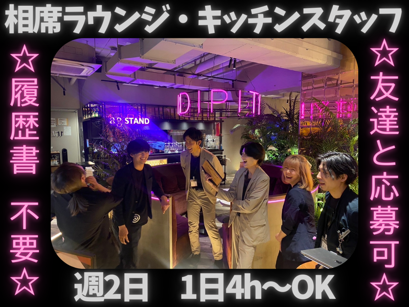 選考プロセス お電話でのお問い合わせは下記までご連絡ください。 03-6273-1336(本社/9:00〜17:00まで) 03-6452-5471(店舗/17:00以降) 面接日・勤務開始日等、ご相談に応じます。 お気軽にご相談ください。 ★面接はオンラインにて実施いたします! 対面での面接もご相談に応じて実施いたします。 ★履歴書不要! ★友達同士の応募もOK!