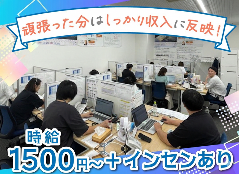 時給1,500円~2,000円 給与詳細 基本給:時給 1500円 〜 2000円 ★インセンディブあり ★昇給あり 【給与例】 給与例 月収42万4000円(時給1500円×8h×22日+歩合16万円)