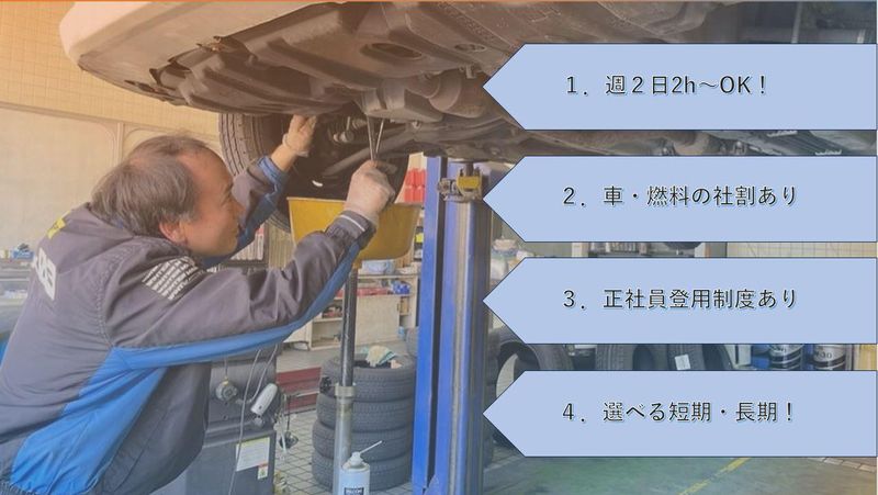 求めている人材 【応募資格】 ・普通自動車免許(必須) 【歓迎条件】 ・土日祝に勤務できる方 ・日中の時間帯(8:00~20:00)に勤務可能な方 ・未経験者歓迎 【職場の雰囲気】 当店は地元密着型のお店です。 ご来店されるお客様の8割が常連様なので、顔見知りのお客様も多く、安心してスタートできます。 「いつもありがとう」「助かったよ」といった温かいお言葉をいただくことも多く、和気あいあいとした居心地の良い職場です。 【スタッフの声】 <勤務1年目・Aさん> 「稼げる仕事を探していた」ことがきっかけで当店に決めました。 これまで様々な仕事を経験してきましたが、ここでは車に関する技術が身につくのはもちろん、正社員へのお誘いをいただくなど、しっかりと評価してもらえる環境にやりがいを感じています。