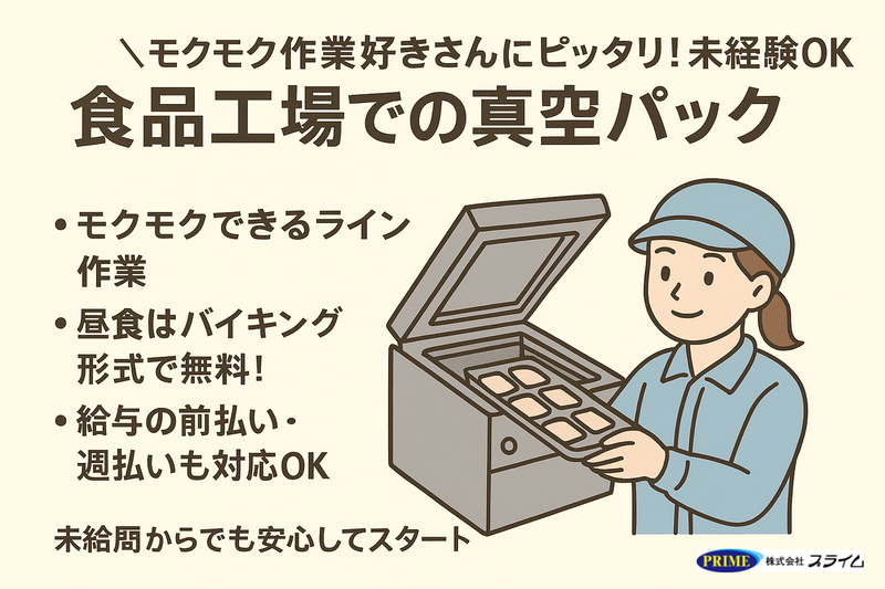 仕事内容 \ モクモク作業好きさんにピッタリ!未経験OK / 食品工場での真空パック作業スタッフ 【仕事内容】 高齢者施設向けの給食を製造する工場でのお仕事です。 行う作業はシンプルで繰り返し作業が中心! ・出来上がった食品を機械へ分量どおり投入 ・機械が自動で真空パック 上記の作業を繰り返すだけ ※未経験からでも安心してスタートできます! 【おすすめポイント】 ・モクモクできるライン作業 ・昼食はバイキング形式で 無料!昼食代の節約に ・給与の前払い・週払いも対応OK