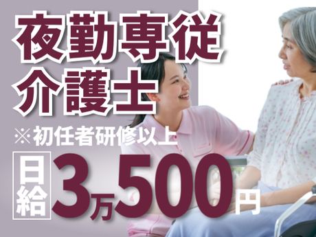 仕事内容 ■介護付有料老人ホームにおける夜勤専従介護業務全般 <主な業務> ・食事介助/排せつの介助 ・食事配膳、見守りとサポート ・着替え ・車いすやベッドへの移乗 ・掃除、洗濯、環境整備 ・夜間の巡回、見守り など <お仕事の1日のスケジュール例> 16:30~ 出勤、申し送り、業務分担表確認 17:30~ 夕食:食事の配膳、下膳などの食事介助 18:30~ 就寝介助:臥床までの見守りとサポート 21:00~ 夜間帯の見回り、コール対応 00:00~ コール対応、物品補充、休憩 05:00~ 早朝の見回り、コール対応 07:00~ 起床介助:起床までの見守りとサポート 07:30~ 朝食:食事の配膳、下膳などの食事介助 ~09:30 フロア対応、介護記録作成、申し送り、退勤 <派遣先> 定員74名介護付有料老人ホーム ※高級ホテルのようにきれいな施設♪ <通勤方法・その他補足> ※バイク、自転車通勤OK <新型コロナウイルス感染防止対策実施> マスク着用での勤務、アルコール消毒液完備などの感染対策をし、利用者様もスタッフも守れるよう体制を整えています。 <受動喫煙対策> あり(屋内禁煙) ここがポイント ■日給3万500円(介護の資格をお持ちの方) ■16:30~翌9:30(実働15時間)勤務 ■週2回勤務よりご相談ください ■残業ほぼなし ■定員74名介護付有料老人ホーム(居室総数62室) ■高品質な介護サービスを提供し、建物の内外共に高級感のある施設です ■最寄駅より徒歩1分!超駅チカで通勤便利♪ ■バイク、自転車通勤OK