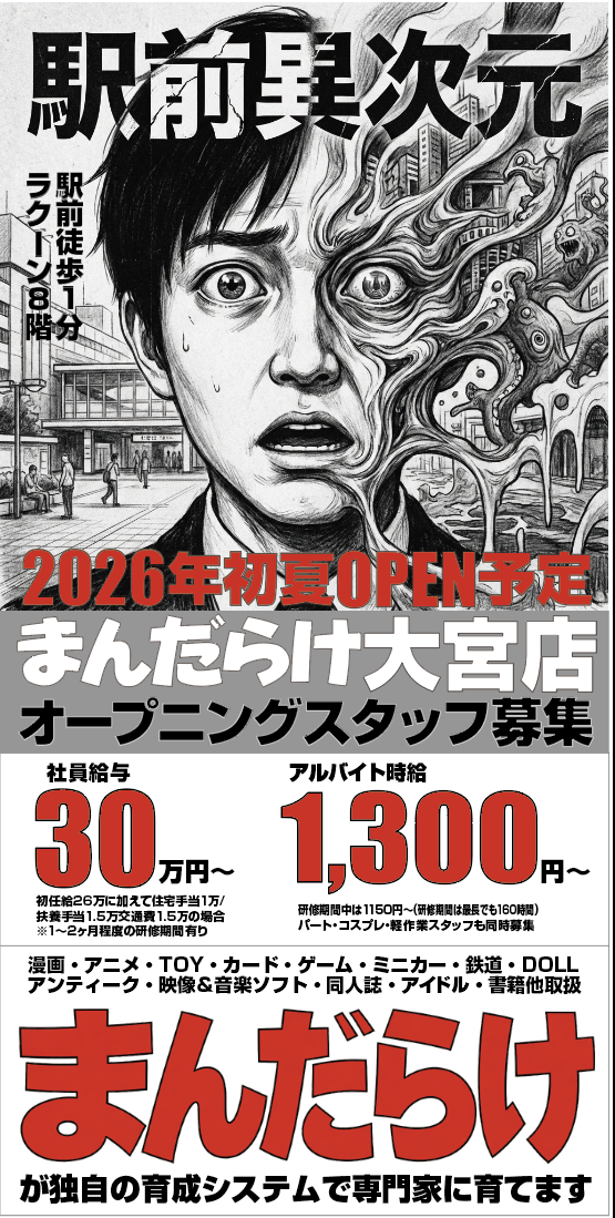 仕事内容 *好きを仕事にする Fun To Job!* アニメ、漫画、TOY、カード、ゲーム、アイドル、同人誌、車、鉄道等々、幅広い商品を扱うお店です。 接客・レジ・商品の補充や通販アップ作業等をお願いします。 世間でオタクでも、まんだらけではそれが才能。 まだ知り得ぬ世界観を、先輩(オタクエリート)と体感できる場所。 それがまんだらけです。 アニメ・ゲーム・マンガが好きな方は大歓迎 あなたの好きを仕事にしませんか? わからない事は先輩や同僚に遠慮なく聞いてください ※もちろんアニメなどに詳しくなくても大丈夫です +・+・+・+・+・+・+ *「まんだらけ」は* クリエイターの作品が人々の手に渡るための「時」「場」を提供する企業です クリエイターは、一つの作品を生み出すまでに大変な努力と時間を費やします。 私たちはその想いを共有し、ゲームや同人誌、玩具など 全ての作品が最大限の価値を持てるようにできる限りのお手伝いをしています。 共感し、一緒に働いてくれるとすごくうれしいです◎ +・+・+・+・+・+・+ 中野店をはじめ都内店舗での募集となります。 勤務地は渋谷店・コンプレックス(秋葉原)・CoCoo(秋葉原)・ラララ(池袋)・那由多(池袋)もあり 希望勤務地がありましたら、お気軽にご相談ください。