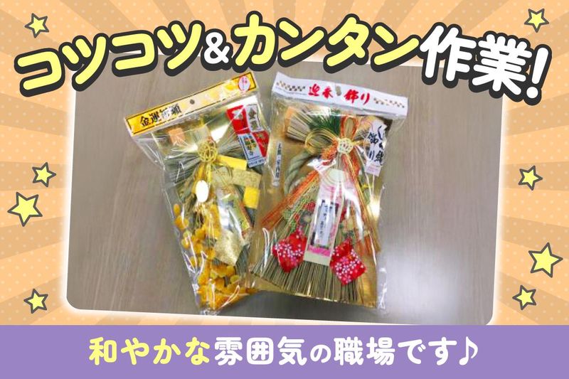 仕事内容 ┌──────────────────┐ 求人のポイント └──────────────────┘ ✅週3日〜OK!主婦さん活躍中 ✅土日祝休みで家庭と両立できる ✅扶養内勤務も可能 ✅車・バイク・自転車通勤OK ✅「近くで働きたい」という方も歓迎 ✅頑張りを昇給でしっかり評価 ┌──────────────────┐ お任せするお仕事について └──────────────────┘ 日本の伝統である『正月飾り』『お盆用品』 の専門店でのお仕事です。 上記商品の梱包、袋詰め、ピッキングなど 倉庫内作業を行っていただきます! ★★ ここがポイント ★★ シンプルな軽作業なので 未経験でも始めやすいのが魅力! 「コツコツ・モクモク作業が好き・得意」 という方にピッタリ♪ ┌──────────────────┐ 家庭と両立する主婦さん活躍中 └──────────────────┘ 主婦さんがメインに活躍しています。 <扶養内勤務OK> <週3日~OK> <土日祝休み> <9時~17時の固定勤務> 働きやすさが揃っています◎ 負担がなく無理なく続けられる 仕事をお探しの方にオススメです! ┌──────────────────┐ 会社・職場環境について └──────────────────┘ 当社は、正月飾りやお盆用品を 専門に扱う、国内でも珍しい会社です。 全国のスーパーや生協、 個人商店などと取引があり、地域ごとの 風習に合わせた商品を提供しています。 周りを緑に囲まれたオフィスでは スタッフが和やかな雰囲気の中で活躍中! 落ち着いた空気感です。 車・バイク・自転車通勤が可能なので 近隣にお住まいの主婦さん・ フリーターさんも在籍しています。