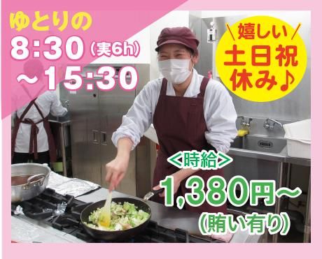 時給1,380円以上 給与詳細 基本給:時給 1380円 〜 ◎時給UP1380円 ◆美味しい賄いあり♪ ◆交通費支給(上限/月2万円) 【給与例】 給与例 【月収】 18万2160円以上可 (時給1380円×1日6h×月~金・週5日/月22日稼働の場合) ◎ゆとりの8:30~15:30/実6h!退勤時間も早いので身体への負担も少なく長期安定収入可! ◎家庭とお仕事ラクラク両立OK♪主婦・女性調理スタッフさんも大勢活躍しています♪
