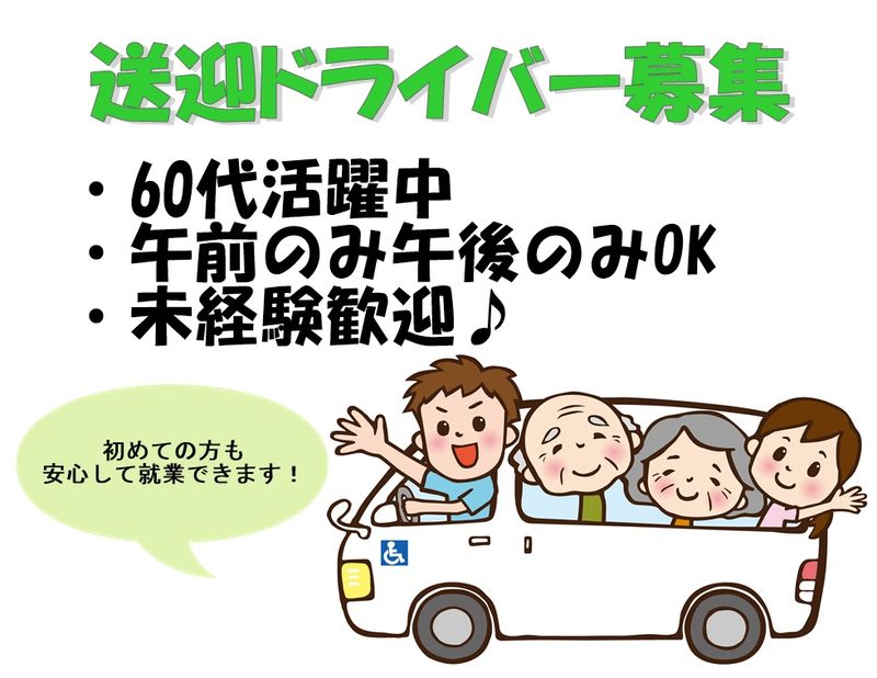 仕事の内容 ☆★ミドルの方多数活躍中です★☆ デイでの送迎スタッフさん募集★ *ご利用者様40名/日 高齢者の方に喜ばれる、やりがいのあるお仕事です! 挨拶やコミュニケーションを大事にしています♪ 未経験の方やブランクのある方もOK◎ 介護の資格お持ちの方尚良* 【この求人のポイント!】 ・週払い・前払いOK! ・30代・40代・50代活躍中! ・週1日~相談OK! ・午前・午後どちらも勤務可能な方優遇! ・曜日・日数などご相談ください♪ ・日曜はお休みです* ・マイカー・バイク通勤可!(無料駐車場・駐輪場あり) ・ハイエース・キャラバンなど運転可能な方 ・安全運転できる方優遇◎ ・Wワークや扶養内勤務にもオススメ◎ 【ひまわりのサポート体制】 ・お忙しい方やお電話が苦手な方はLINEでの相談OK ・多数案件あり/ご希望に合わせてご案内可能! ・専任のコーディネーターが、 お仕事探し~就業後のアフターフォローまで徹底サポート! ・面談・初日も同行するので安心◎ 【業務内容】デイ利用者様の送迎業務 簡単な車椅子の操作あります! ※操作方法は丁寧に教えて頂ける環境です♪